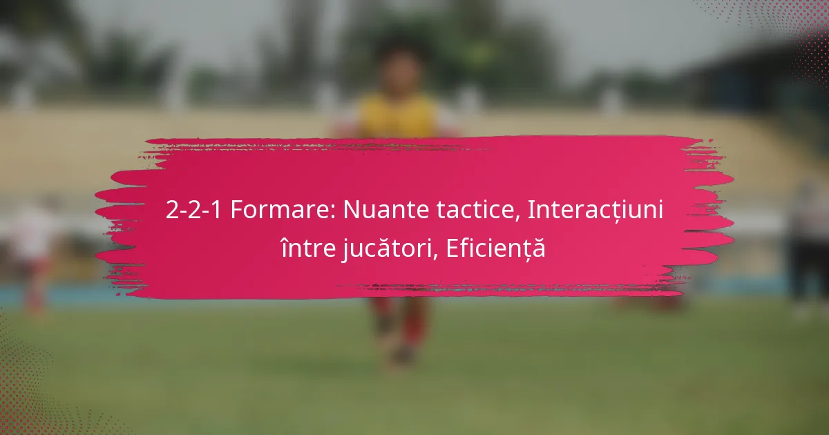 Formația 2-2-1 este o aranjare tactică care include doi apărători, doi mijlocași și un atacant, concepută pentru a crea un echilibru între apărare și atac. Această structură nu doar că facilitează controlul eficient al mingii și jocul de tranziție, dar îmbunătățește și gestionarea spațiului, permițând echipelor să își adapteze strategiile împotriva diferitelor adversare. Înțelegerea rolurilor distincte și interacțiunilor jucătorilor din cadrul acestei formații este esențială pentru optimizarea eficienței sale în diverse scenarii de joc.